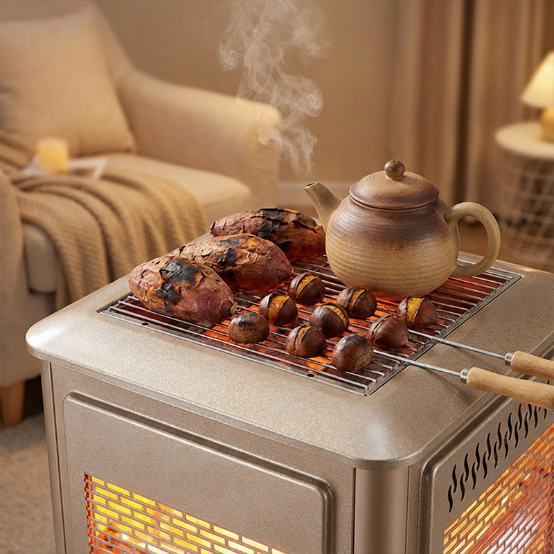KONSTRUKCJA O PODWÓJNEJ FUNKCJONALNOŚCI — Ciesz się przytulnym ciepłem i jednocześnie grilluj swoje ulubione przekąski. To wszechstronne urządzenie pozwala zaoszczędzić miejsce i jest idealne, aby zapewnić komfort i dobrą zabawę podczas rodzinnych spotkań.