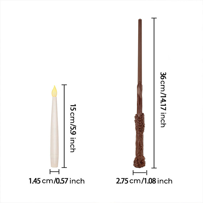 Rozmiar: 1,45 cm/0,57 cala*15/5,9 cala (świeczki), 2,75 cm/1,08 cala*36 cm/14,17 cala (różdżka)