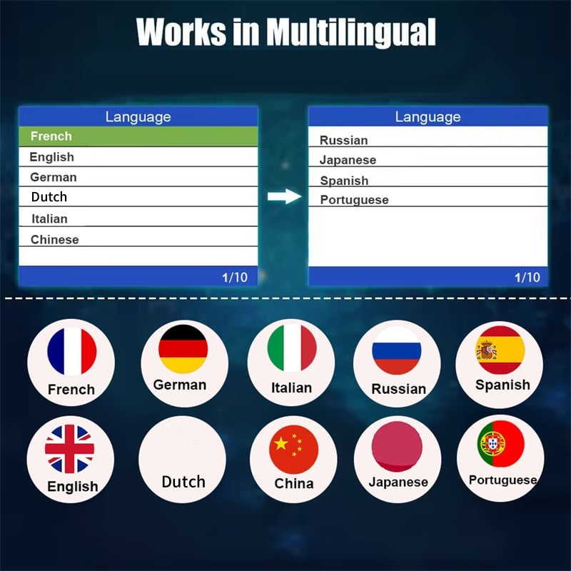 WSPARCIE WIELOJĘZYCZNE: Obsługuje 10 języków: angielski, niemiecki, francuski, hiszpański, włoski, rosyjski, holenderski, chiński, japoński i portugalski, idealne rozwiązanie dla kierowców międzynarodowych.