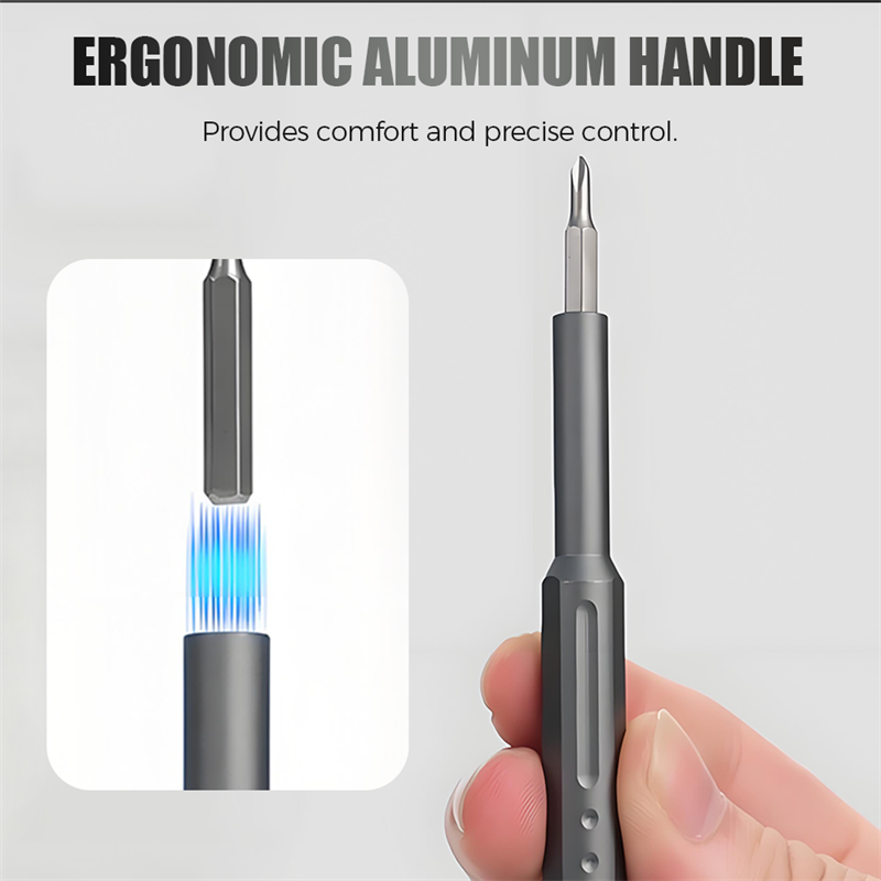 ERGONOMICZNA ALUMINIOWA RĄCZKA - Lekka rączka ze stopu aluminium zaprojektowana dla komfortu i kontroli podczas precyzyjnych zadań. Jej antypoślizgowy uchwyt i obrotowa nasadka umożliwiają płynną, jednoręczną obsługę, redukując zmęczenie podczas długich sesji naprawczych.