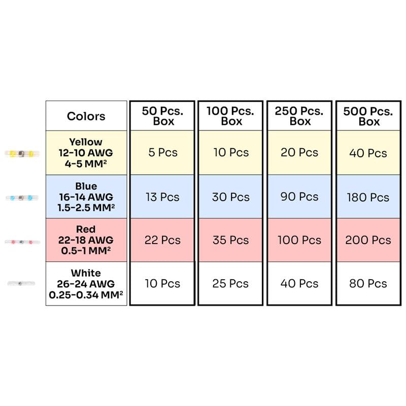 Kolorowe oznaczenia przewodów umożliwiają łatwą identyfikację odpowiedniego rozmiaru złącza dla każdego zastosowania. Zmierz grubość przewodu, a następnie skorzystaj z tabeli przeliczeniowej grubości przewodów na opakowaniu, aby bez trudu wybrać odpowiednie złącze.